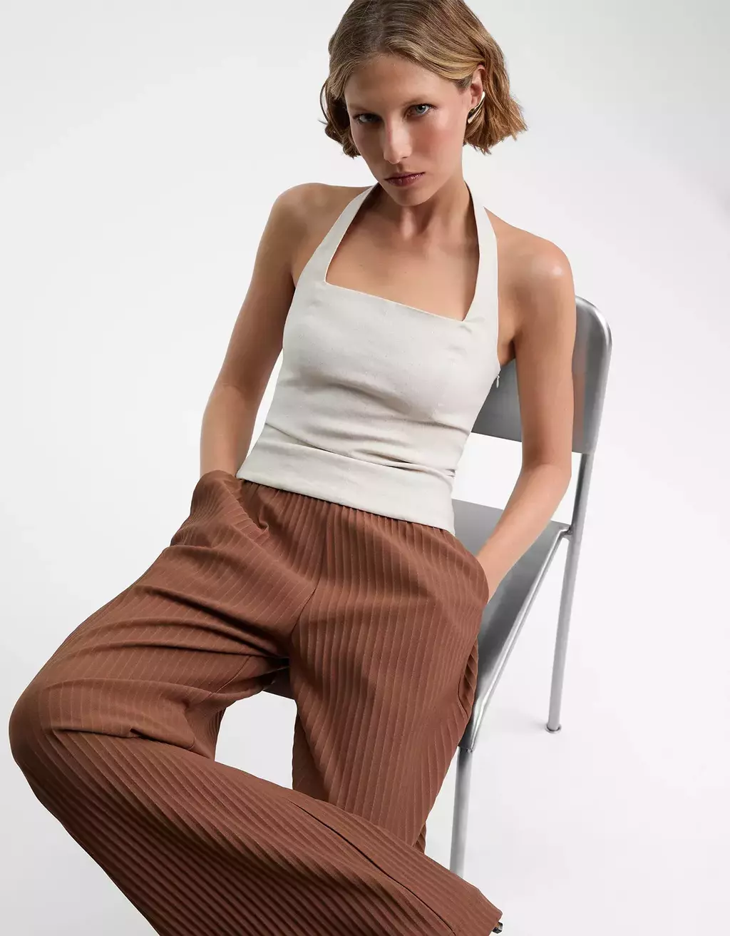 • Tecido com linho, aspecto estruturado e bastante elastano